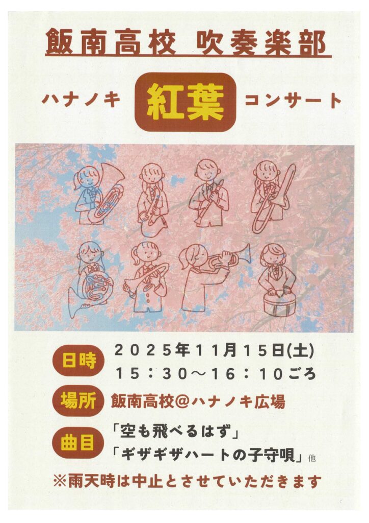 2025.11.11 ニュース 飯南高校「ハナノキ紅葉コンサート」開催 飯南高校のハナノキが今年も見頃を迎えています。11月15日(土)の15時30分から16時10分ごろまで、飯南高校吹奏楽部の「ハナノキ紅葉コンサート」も開催されます。